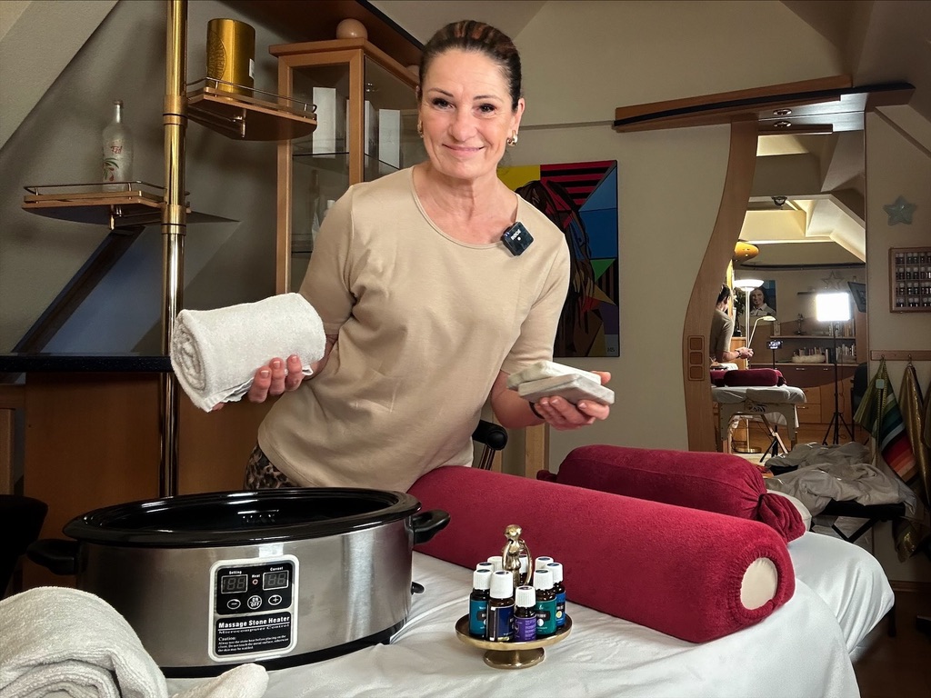 #10 – Hier schätze ich die Bio-Baumwollhandtücher von Ringana sehr, denn sie sind natürlich produziert und qualitativ sehr hochwertig. Hier rolle ich gerade Handtücher für die Kompressen auf.